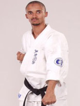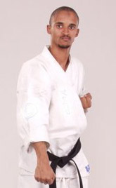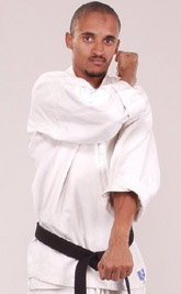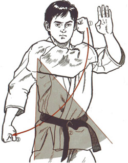 This parry is used against left attacks, in contrast to outside blocks. Again counter with the closest part of the body which will be the left arm, (for left handed, the right). Start with the hands in the normal position for the fighting stance, then slide the blocking hand smoothly down, turning at the wrist to sweep away to lower left. The principle is the same as for the outside block: meet the opponents strength-punch or kick-and lead it away. The left hand drops sharply, so its more important than ever to guard the face with the right.